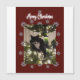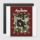 Christmas card with my Tuxie cat on the tree. Burgundy background. Merry Christmas.