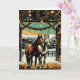 Pretty Christmas card with the graphics of two horses standing in a barn decorated in holiday wreathes and pretty twinkling Christmas lights. r. These horses are done in a cartoon comic book pop art style. Inside of card has a horse and Christmas pun.