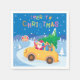 This design features a cute cartoon of Santa Claus and a reindeer collecting a Christmas tree in a car with "Merry Christmas" written in colourful popular typography.