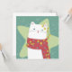 A cute illustration of a cat wearing a red scarf and wrapped in Christmas lights