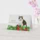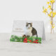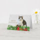 This seasonal card features a grey and white tabby cat, holiday greenery, snowflakes, and the greeting Merry Christmas in gold. There is an inside greeting that you may personalise with your own words. Any cat lover will like this Christmas card.