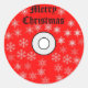 Digital stencil painting of dark coloured "Merry Christmas and white snowflakes," solid red background, in a form of a CD.