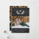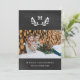 This rustic holiday card features two of your personal photos, with a white laurel wreath surrounding your monogram on a black chalkboard look background.