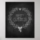 A Christmas poster depicting a wreath around the text "'Merry Christmas!" on a black chalkboard. This poster looks like a real chalkboard, but you won't have to deal with chalk dust! Perfect for the holidays. We're leaving all size options open, but the poster was optimised for an 8x10 aspect ratio, so please check that the poster still looks good before ordering. FONT CREDIT The pretty font used in this product is the Pea Noodle's Girlfriends font by Kevin and Amanda, available at http://www.kevinandamanda.com/fonts/
