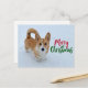 This beautiful Corgi Christmas postcard features a pretty winter photo of a red and white Pembroke Welsh Corgi with a tail, standing in the snow next to elegant typography reading Merry Christmas. Adorable holiday postcards for a dog lover.
