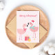 NewParkLane - Tropical Christmas Postcard, featuring two cute pink flamingos wearing a Santa hat, and the other candy cane striped socks, with a Christmas gift, a pineapple and a starfish.