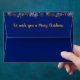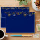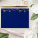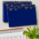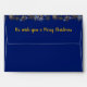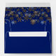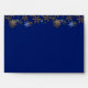 Christmas card envelope in dark blue with gold snowflakes design. The flakes fall from the front top and flap and the design carries over to under the flap. A line of gold text across the flap is easy to customise. The sample wording is, “We wish you a Merry Christmas”. Use to send Christmas cards or holiday party invitations.