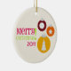 A Christmas ornament featuring an illustration of three ornaments decorated with a snowflake, a Christmas tree, and a star. Text "Merry Christmas" at left. Personalise with the year. Design has a pink, green, burgundy, orange, and yellow colour scheme.