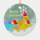 Merry Christmas Dinosaurs Ornament. Three happy smiling dinosaurs: orange Diplodocus, blue Stegosaurus and yellow Triceratops with santa hats in a snow winter landscape with snow flakes falling with customisable text "Merry Christmas" ornament. On the back also our 3 dinosaur friends and customisable text"Merry Christmas". This beautiful Christmas ornament is fully customisable, add your personal text, personalise with your images and texts! An adorable sweet ornament in the Christmas tree, hanging on your wall or in the window!