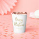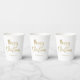 These simple and stylish holiday paper cups say "Merry Christmas" in modern, casual faux gold script typography on a white background.