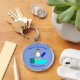 This fun Christmas keychain features a cute little grey and white penguin with beady black eyes and yellow beak and feet. The penguin is holding a big blue fish with one flipper and standing on a pale blue lump of ice. There is an open present next to the penguin complete with a festive ribbon.