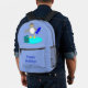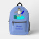 This awesome backpack features a cute little grey and white penguin with beady black eyes and yellow beak and feet. The penguin is holding a big blue fish with one flipper and standing on a pale blue lump of ice. There is an open present next to the penguin complete with a festive ribbon. There is custom text so you can include a message. The default message reads happy holidays.