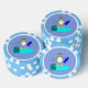 This awesome set of poker chips features a cute little grey and white penguin with beady black eyes and yellow beak and feet. The penguin is holding a big blue fish with one flipper and standing on a pale blue lump of ice. There is an open present next to the penguin complete with a festive ribbon.