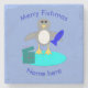 This awesome Stone Coaster features a cute little grey and white penguin with beady black eyes and yellow beak and feet. The penguin is holding a big blue fish with one flipper and standing on a pale blue lump of ice. There is an open present next to the penguin complete with a festive ribbon.