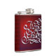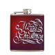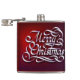 A stainless-steel hip flask with a red gradient background, featuring the words "Merry Christmas" in an elegant, flowing white script. The flask has a silver cap and hinge, and the overall design is festive and modern.