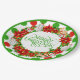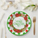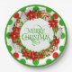 Vibrant and festive paper plate with a "Merry Christmas" floral wreath and a pattern of large dots in traditional Christmas green and red colours on white background.
