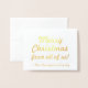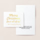 This customisable gold foil Christmas greeting card design features the message "Merry Christmas from all of us!" on the front, along with a customised message on the inside. It could be sent to friends and family in celebration of Christmas.