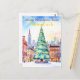 A festive postcard featuring a festive Christmas tree in snowy New York City, with the skyline as a backdrop. A holiday greeting card that says “Merry Christmas from New York.”