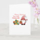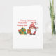 Merry Christmas From Santa Bringing Gifts on a Christmas Card with Santa holding a gift and candy cane and a pile of gifts next to him.