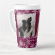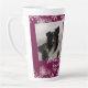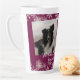 Tall burgundy wine coloured latte mug with two photo templates and custom text. A snowflake design at top and bottom makes this a perfect Christmas gift or winter birthday gift. Personalise the text with a name and customise in two lines beneath angled photos of cats, dogs, or any pet. Or make it with pictures of people - whatever you like. The pretty wine purple colour makes the furbaby photos stand out. Text is white.