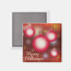A special Merry Christmas magnet to celebrate the holiday season with hanging red glowing ornaments against a starry, christmasy background.