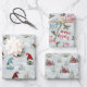This set of 3 Christmas wrapping paper sheets features 3 watercolor holiday patterns- cute Christmas gnomes in the snow with trees, red festive cabins in the snowy woods, and Merry Christmas texts in handwritten script.