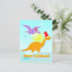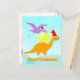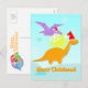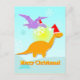 Merry Christmas Greetings Dinosaurs Postcard. Cute little orange cartoon Diplodocus and purple Pteranodon with a red Santa hat in a happy sunny snow landscape with snow flakes falling from the sky postcard. This "Merry Christmas!" dinosaurs postcard is fully customisable! Change the text "Merry Christmas!" and add your images & text! A cute X-mas greetings dinosaur card for little big dino fans!