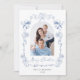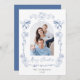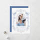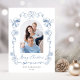 Elegant holiday card featuring your photo in an arch within a dusty blue hand-drawn frame adorned with seasonal bells, bows, and poinsettia florals, "Merry Christmas" in a stylish dusty blue script, and your family name and the year in classic serif typography.
