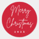 Merry Christmas stickers with the text "Merry Christmas" in a handwritten style script font on a red background with the year or custom text below.