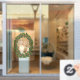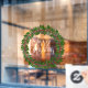 Merry Christmas handwritten text and floral wreath modern window cling displaying the text “Merry Christmas” in handwritten style.