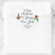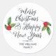 A modern Merry Christmas Happy New Year sticker or envelope seal with offblack elegant script calligraphy and simple stylish typography on a white background with a touch of watercolor holly and berries. Exclusively designed for you by Happy Dolphin Studio!