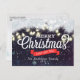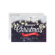 Merry Christmas and Happy New Year Holiday Greeting Postcard Templates - Christmas Pine Tree Branch, String Lights and Purple Sparkle Bokeh Lights.