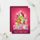 A save the date flat card with a cool Christmas illustration. The text says Merry Christmas & Happy New Year. Designed with a tree shaped mound of presents with festive snowflakes, stars, christmas baubles and glowy looking sparkles. The background is a vibrant reddish pink colour. Place your personalised info on the back.