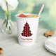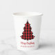 This design features a merry Christmas calligraphy script cute paper cup with a simple Christmas tree buffalo check, a stylish trendy calligraphy script text, a rustic country farmhouse minimal, minimalist festive holiday pattern, red black and white design, coffee tea cocoa hot drinks supplies, a creative simplistic chequered style, Christmas holiday fun celebration, a custom disposable party paper products
