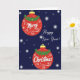 In this card, we see a festive holiday scene with two bright red Christmas ornaments as the centerpiece. The top ornament says "Merry" in elegant white script, while the bottom one completes the greeting with "Christmas." To the right displays Happy New Year! Both ornaments are carefully designed with a golden hanger and a green, stylized laurel wreath embellished with a small amber berry, giving them a classic seasonal charm.