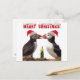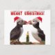 Merry Christmas with funny two puffins with red santa hats and going to kiss
