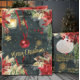 A luxurious and festive Christmas winter holiday card featuring a dark green forest winter's night background with shimmery gold snowflakes, watercolor-painted poinsettias, pine cones, red berries with a warm lit lantern and a shining red ball ornament on red ribbon falling in mid-air and Merry Christmas written in gold brushstroke script. The greetings "Feliz Navidad, Joyeux Noel, Happy Holidays," can be used instead of Merry Christmas and they can be accessed in the Design Panel.