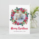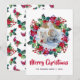 This chic holidays design features your favourite photo surrounded by a watercolor floral wreath of holly, Christmas stockings, poinsettias and candy canes in festive red and green. Below in modern red text "Merry Christmas" with your family name and year below in plum typography. On the reverse is a coordinating pattern of watercolor Christmas stockings and floral elements. Simply add your own photo and edit the text in the text boxes provided.