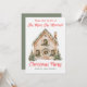 A Merry Christmas House Party Invitation designed with a cozy cottage house decorated for Christmas on a white background. The front text includes: Please Join Us For A, The More The Merrier! Christmas Party, along with the host names bright festive colors. The reverse text includes: The Date and Time, The Location Name and Address and your RSVP Details on a festive green background with a festive accent. To personalize, simply insert your party details into our easy template, replacing the sample text.