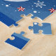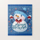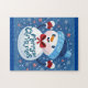 Illustration of a jigsaw puzzle with a snowman wearing a blue hat and red bow tie, surrounded by snowflakes and stars on a blue background, with the words "Merry Christmas" written in cursive. The style is cartoonish and festive, suitable for a holiday-themed product.