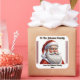 A festive square sticker adorns a beautifully wrapped gift, showcasing a jolly Santa Claus. The warm holiday colours create a cheerful vibe, perfect for spreading joy.