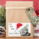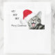 Silver tabby kitten in a Santa Hat with his mouth open giving a cheerful Ho ho ho, Merry Christmas greeting rectangular sticker. Text can be easily changed or removed, kitten can be repositioned.
