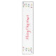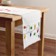 A whimsical table runner says Merry Christmas in red on a snow white background. Each end has an image of a scattered string of Christmas tree lights. The lights are red, green, blue and yellow. You can change the words if you like. Would look good on any holiday table setting.