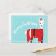 A Merry Christmas postcard with a cartoon llama in a Santa suit and hat on a blue background.
