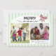 This horizontal Christmas card features a joyful and heartwarming design framed within a soft, light green striped border and adorn with a red and green bow. At the top, the phrase “MERRY memories” is prominently displayed, blending a bold, festive font with elegant script. A red and green ribbon bow adds a cheerful holiday touch in the upper right corner. The card offers space for 2 photos, and custom text, on the back side, for a personal message. The design beautifully conveys warmth, connection, and celebration, making it a lovely holiday greeting.