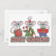 Three cute christmas mice, one holding a candy cane, one holding a present and one holding a 'Joy' sign, standing on 'Merry Christmas' text.