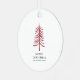 The design features a modern minimalist red hand drawn Christmas tree on white background with modern typography. Simple, stylish holiday ornament with black and white typography. Personalise it with details. Easy to edit. Perfect for festive season.