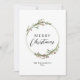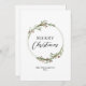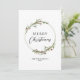 Christmas greeting card featuring a minimalist watercolor wreath with red floral and green foliage accents. This elegant wreath frames the greeting "Merry Christmas". Easy to personalise with your family name, year, and greeting on the back of the card.
