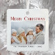 Modern minimalist Christmas ornaments with an elegant style. These brilliant holiday ornaments offer a simple yet sophisticated typography greeting that reads "Merry Christmas (in a festive red colour), Your Family Name and the Year". This custom design features your favourite photo or family picture on the front, highlighted by a unique modern gradient frame on a chic white background. The back of the ornament features a text space for your custom message.