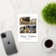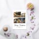 Modern Holiday card, customised with four images of your choice inside a delicate gold frame - real gold foil for Merry Christmas. Personalise this Christmas card template with your own family name and year. Colour of the backer is a festive dark green per default can be changed in the design tool if you like.